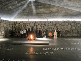 Den Auftakt bildete eine Führung durch die Ausstellung „das letzte Porträt“. Hier werden Werke von Künstlern gezeigt, denen es während ihrer Zeit im Konzentrationslager gelungen ist, heimliche Kunstwerke zu schaffen und sie dann zu verbergen. Viele dieser Künstler überlebten den Holocaust nicht. Weitere Höhepunkte der Veranstaltung waren die Kranzniederlegung in der Gedenkhalle, auf deren Fussboden die Namen von 22 Konzentrations- und Vernichtungslagern eingraviert sind und eine bewegende Rede eines Überlebenden sowie ein Rundgang durch eine Synagoge, die Ausstellungsstücke aus zerstörten Gotteshäusern aus Rumänien beherbergt.