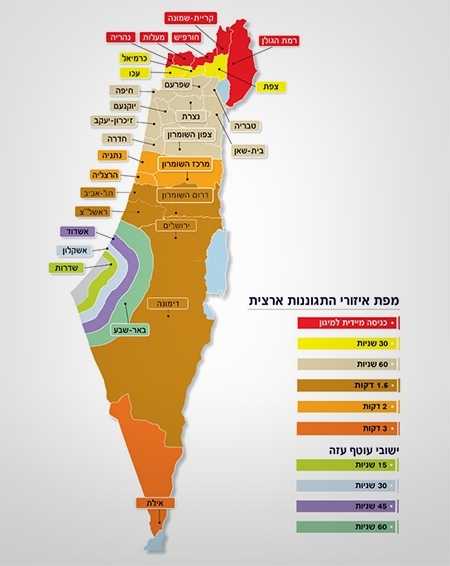 זמן ההתרעה בתל אביב ובגוש דן, וכך גם בראשון לציון – שהצטרפו אתמול למטרות של ארגוני הטרור – עומד על דקה וחצי. באזור אילת, שאליו שוגרו בעבר רקטות מסיני, הונחו התושבים להיכנס למרחבים המוגנים בתוך שלוש דקות.