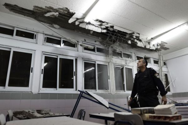 Ein Polizist inspiziert die Schäden nach einem Raketeneinschlag in einer Schule in Aschkelon