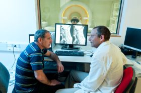 Im Bild: Zwei der Ärzte, die Scharon untersuchen: Prof. Alon Friedman (links) und Dr. Ilan Shelef vor einem Kernspintomographen
