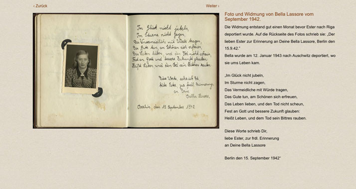 Die Internetseite zeigt zum einen, wofür Yad Vashem steht, aber auch, wie es dort aussieht. Ein virtueller Rundgang durch das Museum steht Usern offen. Erstmals online ist unter dem Titel „Vergiss-mein-nicht“ die Geschichte eines Poesiealbums der Berliner Jüdin Ester Goldstein zu verfolgen. Sie führte das Buch von 1937 bis 1942, bevor sie nach Riga deportiert wurde und dort ums Leben kam. Eine der letzten Eintragungen stammt von ihrer Freundin Bella. „Fest an Gott und bessere Zukunft glauben: Heisst Leben, und dem Tod sein Bittres rauben“, schrieb sie. Genau wie ihre Freundin wurde Bella von den Nazis ermordet.