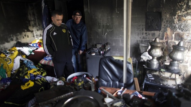 Members of the Beitar Jeursalem soccer club inspect the team’s administrative offices after unknown arsonists set it on fire Friday (photo credit: Flash90)