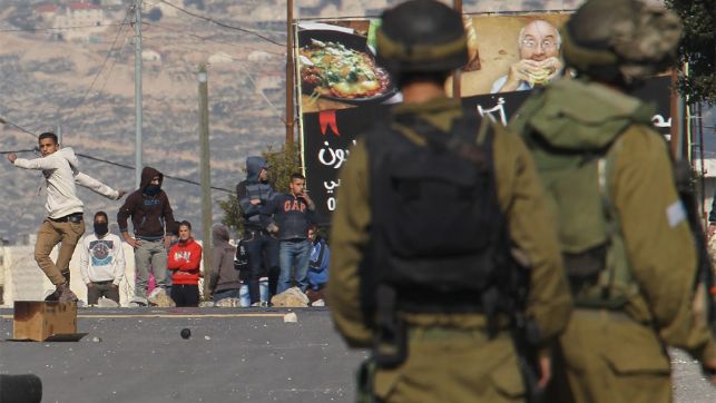 Palästinenser werfen Steine nach israelischen Soldaten in der Nähe von Nablus im Westjordanland. (Bild: Keystone/EPA)