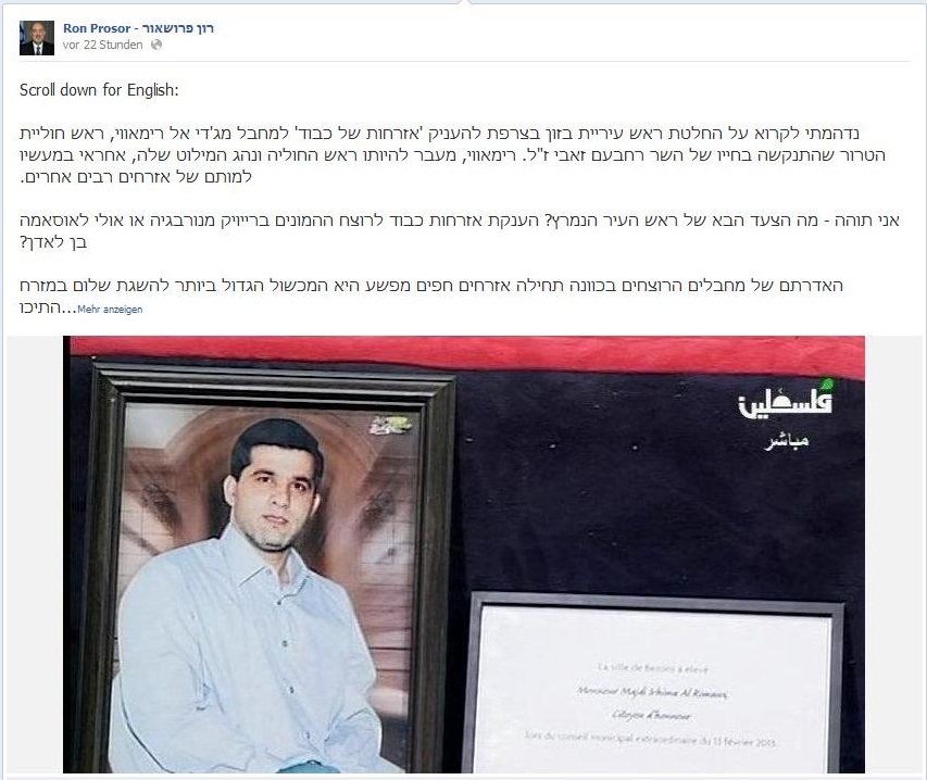 „Ich war […] schockiert zu lesen, dass […] Bezons den Terrorist Majdi al-Rimawi zum Ehrenbürger ernannt hat – den Haupttäter bei der Ermordung des israelischen Ministers Rechavam Ze’evi im Jahr 2001. Dieser Terrorist war auch für den Tod vieler anderer israelischer Staatsbürger verantwortlich.