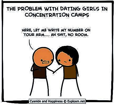Diese Zeichnung illustriert die Frage: Darf man über den Holocaust Witze machen? Unter der Überschrift „Das Problem, sich in Konzentrationslagern mit Mädchen zu verabreden“ sagt der Junge: „Lass mich Dir meine Nummer auf Deinen Arm schreiben. . . Mist, da ist kein Platz.“