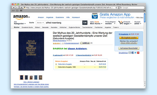Auf Amazon.de findet sich rechtsextreme Literatur wie Chefideologe der Nazis: Alfred Rosenbergs »Mythus des 20. Jahrhunderts«