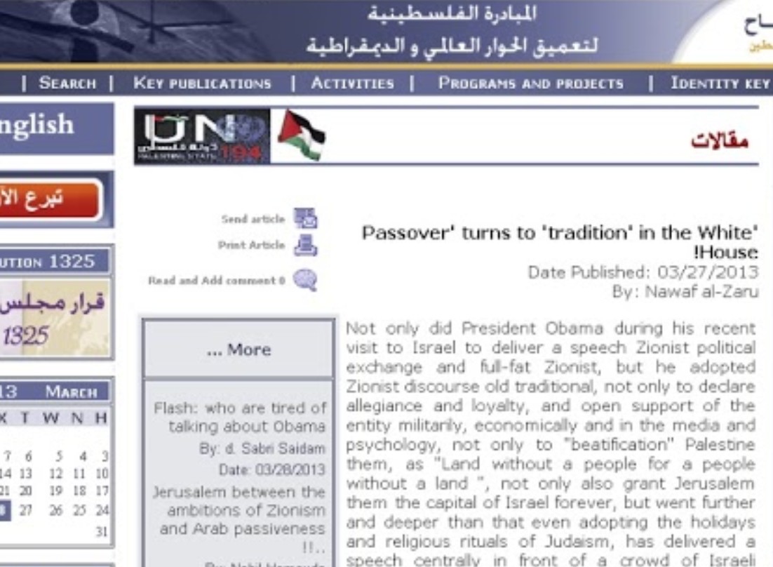 Ende März ist bekannt geworden, dass die palästinensische Organisation Miftah einen Artikel auf ihrer Internetseite veröffentlicht hatte, in dem behauptet wurde, Juden würden das Blut von Christen für das Pessach-Fest verwenden. Die Anti-Defamation League und das Simon Wiesenthal Center sprachen von „unverhohlenem Antisemitismus“. Auf die Kritik reagierte Miftah zunächst trotzig und nannte sie eine Hetzkampagne. Danach verschwand der Artikel von der Seite. Erst fünf Tage später entschuldigte man sich halbherzig für die „verursachten Beleidigungen“, auf den antisemitischen Charakter ging Miftah nicht ein.