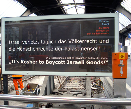 Israel verletzt täglich das Völkerrecht und die Menschenrechte der Palästinenser« steht auf einem grossen Plakat an einem der Gleise des Zürcher Hauptbahnhofes. Überschrieben ist der Aushang mit »65 Jahre Unrecht an den Palästinensern«. In fett gedruckten Lettern heisst es am unteren Ende des Plakats: »It’s Kosher to Boycott Israeli Goods!« (Es ist koscher, israelische Güter zu boykottieren).