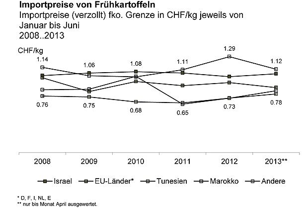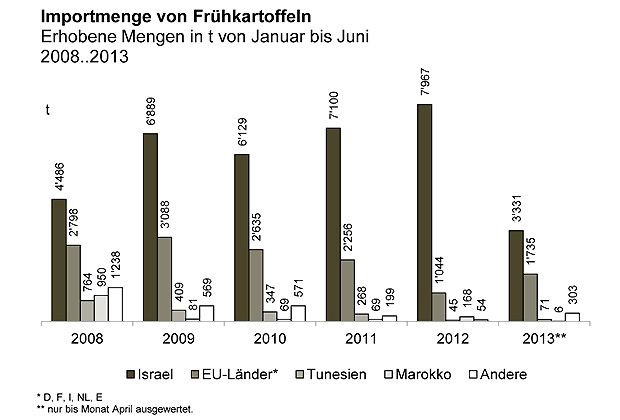 Von Jahr zu Jahr werden immer wie mehr Frühkartoffeln aus Israel in die Schweiz eingeführt. So erhöhte sich deren Anteil am Gesamtmarkt von 44 auf mittlerweile 86 Prozent. Gründe sind Änderungen bei den Importkontingenten.Kartoffeln, die unter Kategorie EU in die Schweiz kommen, müssen aber nicht aus diesen Ländern stammen, teilte die Oberzolldirektion gegenüber dem BLW mit. Die im März 2013 eingeführten Frühkartoffeln aus Deutschland wurden nicht bei unserem nördlichen Nachbarn produziert, sondern ursprünglich in Ägypten.