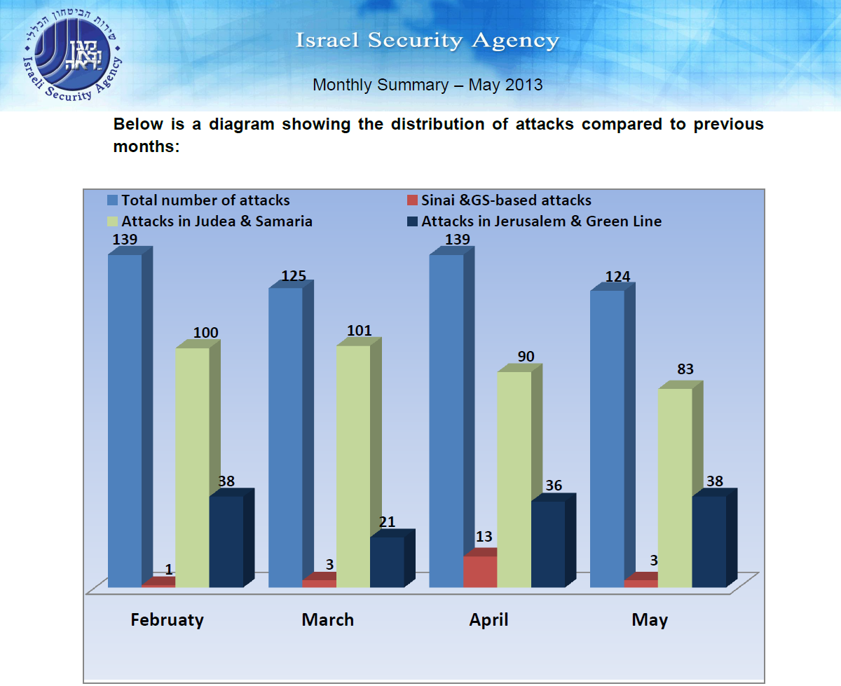 3 attack from the Gaza Strip (12 in April); 83 attacks in the Judea and Samaria (90 in April); 38 attacks in Jerusalem (36 in April).