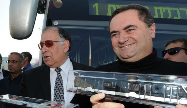 Verkehrsminister Yisrael Katz und Haifas Bürgermeister Yona Yahav bei der Einführung des Haifa Metronit.