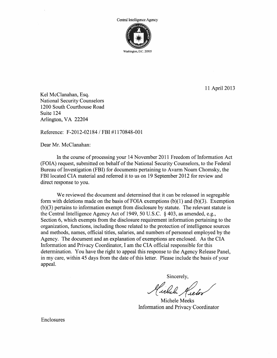 Ein Memo zwischen der CIA und dem FBI, die die Existenz von CIA-Dateien über Chomsky bestätigt.