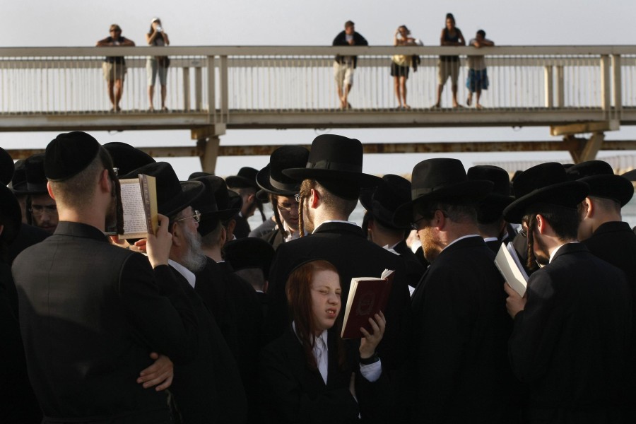 Ultraorthodoxe Juden beten am Ufer des Yarkon-Flusses in Tel Aviv – ein Hingucker auch für Einheimische. 61 Prozent der Israelis befürworten die Trennung von Staat und Religion.