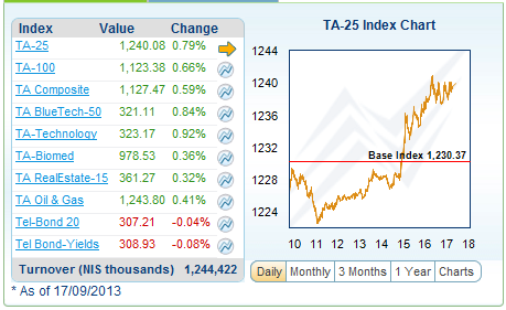 Der Benchmark-Index TA-25 ist seit dem Elfmonatstief am 27. August wieder um 6,4 Prozent gestiegen. Hintergrund waren nachlassende Sorgen um einen Militärschlag der USA in Syrien, dem Nachbarstaat von Israel, da sich die USA und Russland auf einen Plan zur Vernichtung der syrischen Chemiewaffen einigen konnten. Doch das geopolitische Risiko besteht weiterhin.