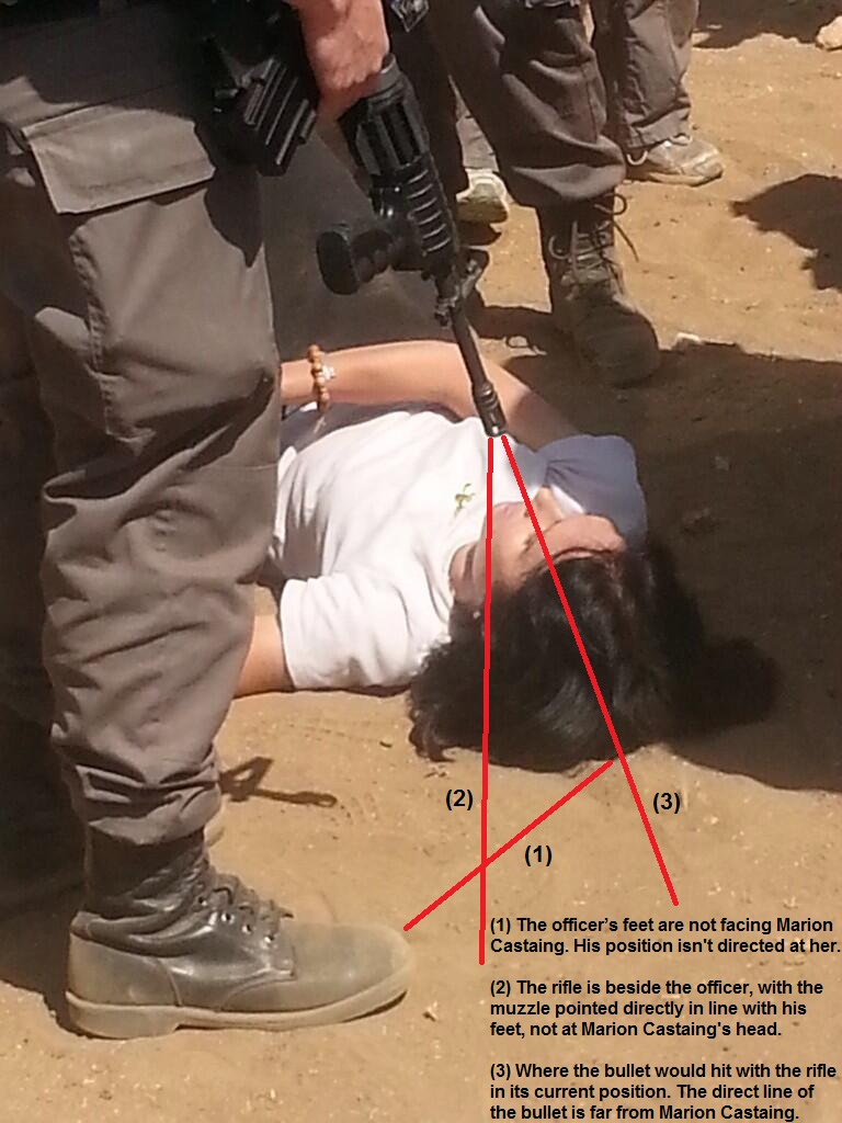 The photo used to spread this misinformation was taken as a screenshot from a video with footage clearly showing that Marion Castaing was neither physically dragged to the floor nor had guns pointed at her. Also, the photo clearly shows that the officer is holding his gun by the magazine, nowhere near the rifle’s grip.