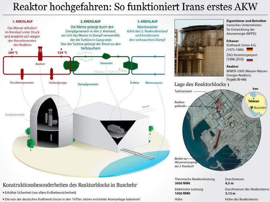 Da das Atomkraftwerk in Buschehr angeblich der „Stromerzeugung“ dient, erregt es beim Westen keine Kritik. Allerdings befürchten Staaten wie die USA und Israel, dass der Iran unter dem Deckmantel der zivilen Kernkraftnutzung heimlich auch an Atomwaffen arbeitet. Nach jahrelangem Streit hatten Teheran und die sogenannte 5+1-Gruppe aus den fünf UN-Vetomächten und Deutschland vor einer Woche ein Abkommen vereinbart.