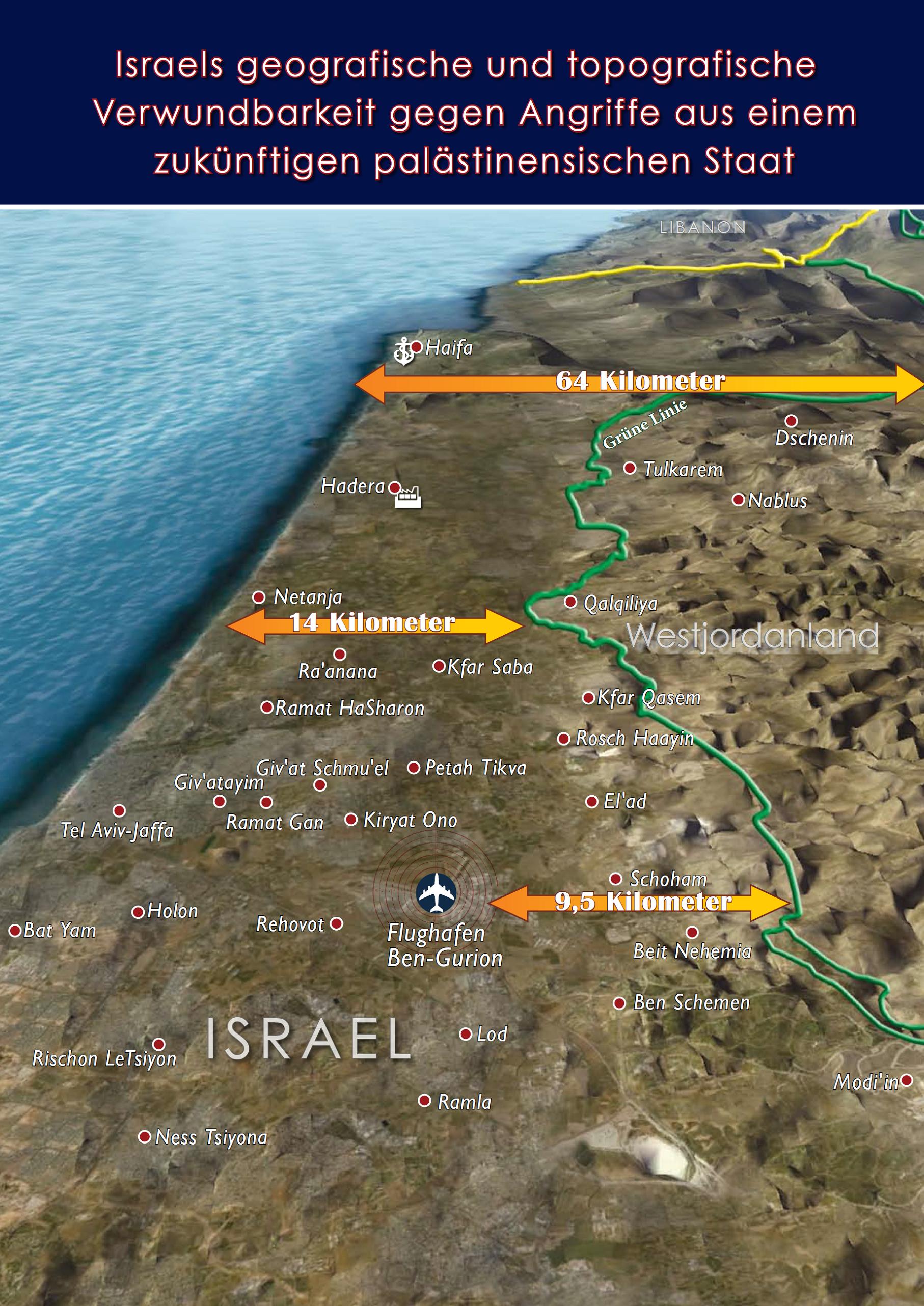Jeder Staat hat das Recht zur Selbstverteidigung und Grenzsicherung gegen feindliche Angriffe und Terror. Israel ist ein kleines Land, umgeben von arabischen Staaten, die 650 Mal so gross sind. Einige beherbergen global agierende Terrornetzwerke. Nur 70 km trennen das Jordantal vom Mittelmeer. Was sind verteidigungsfähige Grenzen Israels? Was sind seine elementaren Sicherheitsbedürfnisse?