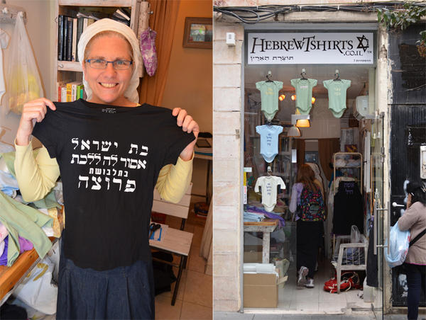 Das T-Shirt ist hauteng und hat kurze Ärmel, auf Hebräisch steht darauf geschrieben: «Töchter Israels ziehen sich nicht aufreizend an.» Ein schwarzes T-Shirt und weisse Buchstaben – die Farben der Thora. Die meisten Bestellungen dafür kommen aus den USA, der Verkauf läuft sehr gut. „Für Jerusalem ist es zu gewagt, deshalb hänge ich es nicht ins Schaufenster. Ich habe Angst, dass mir sonst jemand die Scheiben einschlägt“, sagt sie, es soll eine ironische Provokation sein.