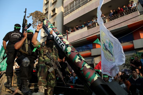 Foto: Hamas-Kämpfer präsentieren bei einer Parade in Gaza-Stadt Raketen, die zum Abschuss auf Israel bereit stehen.