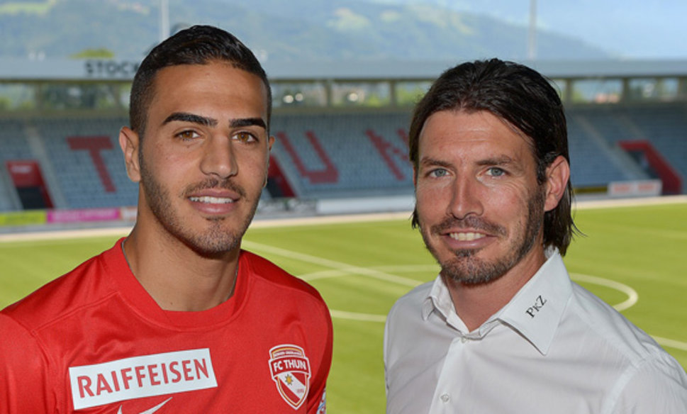 Am Freitag, 4. Juli 2014, präsentierte Sportchef Andreas Gerber (rechts) Thuns Neuzugang Lotem Zino. Bild: zvg