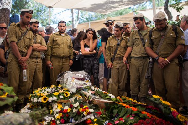 Amit Yoeri (20) aus Jerusalem ist im Kampf im Gazastreifen vor vier Tagen gefallen. Seine jüngere Schwester Noam war eine Schulkameradin meines Sohnes am Jerusalemer Gymnasium. Drei Wochen nach Schulschluss ist nun auch mein Sohn in der Armee. Die gesamte Schule, Schüler, Lehrer und der Direktor, haben Amit auf seinem letzten Weg zusammen mit seinen Kameraden begleitet (Foto oben).