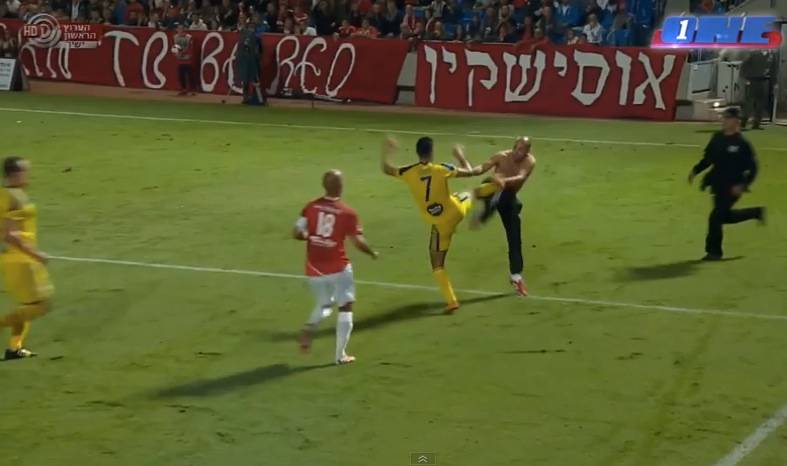 In der 34. Minute wird Maccabi-Spieler Eran Zahavi (27) plötzlich abseits des Spielgeschehens von einem Hapoel-Anhänger mitten auf dem Platz attackiert.