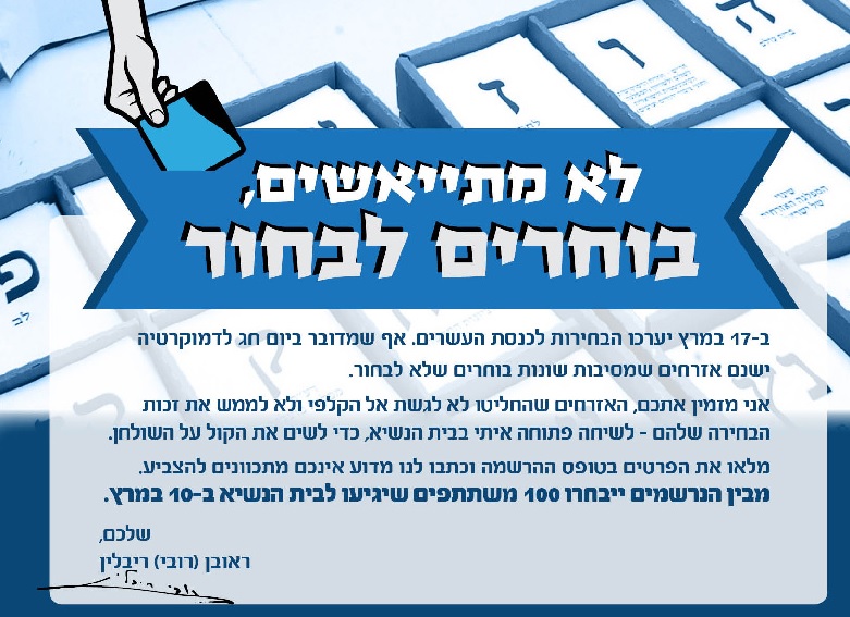 Das Wahlrecht ist ein hohes Gut der Demokratie – meint Israels Staatspräsident Reuven Rivlin. Deshalb lädt er Nichtwähler zu einer aussergewöhnlichen Aktion ein.