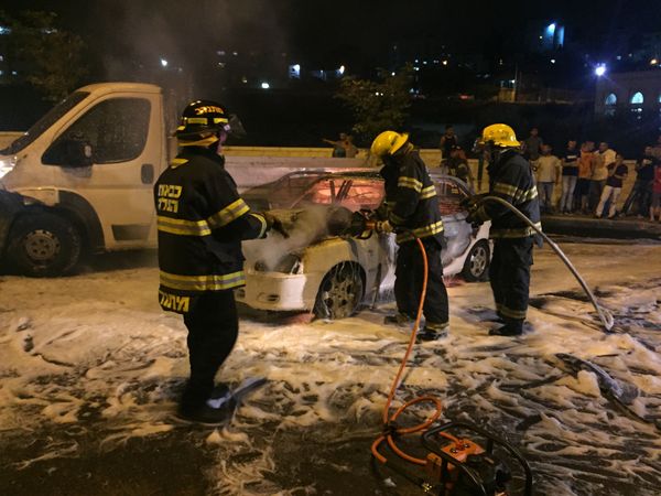 Bei einem Brandanschlag auf ein fahrendes jüdisches Auto in Jerusalem sind am Montagabend drei Menschen verletzt worden. Nach Polizeiangaben war eine Frau (27) zusammen mit ihrem Ehemann unterwegs, als Unbekannte einen Molotow-Cocktail auf den Wagen schleuderten. Das Auto geriet in Brand und rammte ein Taxi, dessen Fahrer leicht verletzt wurde. Das Auto brannte aus (Bild). Die Polizei vermutet, dass die Täter arabische Terroristen sind.