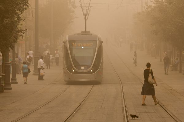 Israelis walk across the lightrail tracks on Jaffa road in Jerusalem on September 8, 2015, as a sand storm hit across Israel. Photo by Yonatan Sindel/Flash90