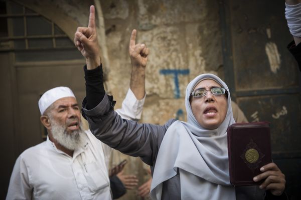 Mit dem Koran in der Hand protestieren Muslime gegen die israelische Polizei auf dem Jerusalemer Tempelberg. Foto: Flash 90