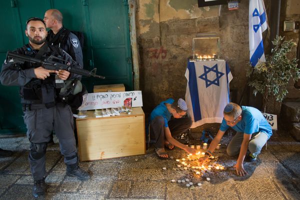 Junge Israelis entzünden Kerzen am Ort des tödlichen Messerangriffs in der Jerusalemer Altstadt. Die Polizei zeigt dort Präsenz. Foto: Yonatan Sindel (Flash 90)