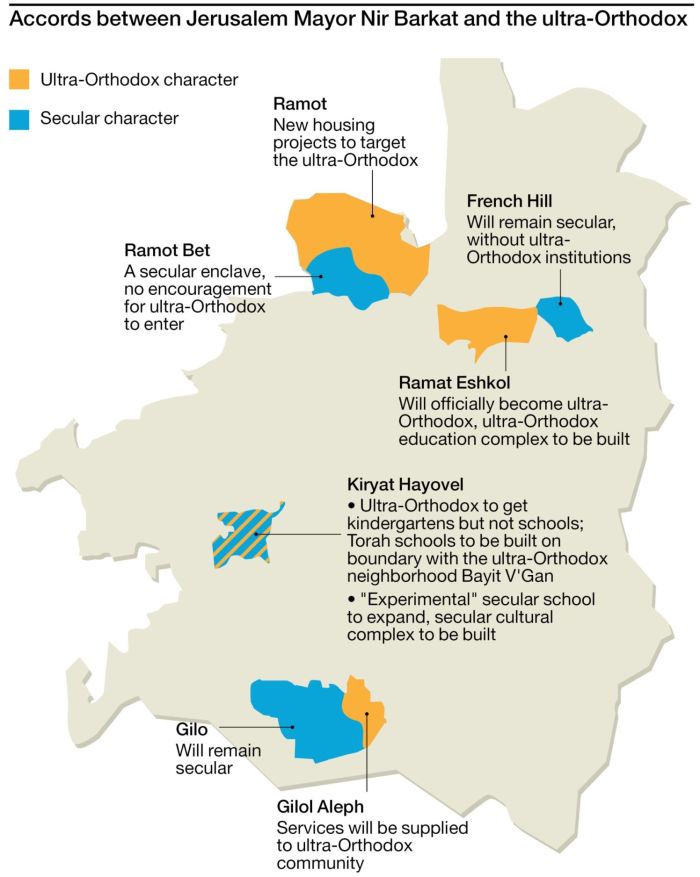 Der Jerusalemer Bürgermeister Nir Barkat hat mit der ultra-orthodoxen Gemeinschaft der Stadt eine Abmachung getroffen. Sie sagt den Haredim weitere Unterstützungen bei der Wohnsituation zu. Wie die Tageszeitung „Ha’aretz“ berichtet, betrifft das auch Nachbarschaften, in denen ultraorthodoxe mit säkularen Bewohnern zusammenleben. Es geht ebenso um zukünftige ultra-orthodoxe Stadtviertel.