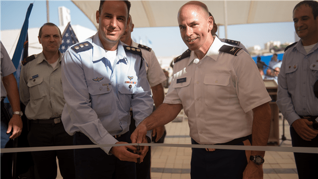 Bild: Col. Liran Cohen, Leiter der Luftverteidigungsschule des IDF, links und Col. David Shank, der US 10. Armee Air & Missile Defense Command, schneidet das Band, um die erste amerikanische Militärbasis in Israel, in der Mashabim Air Base zu öffnen , am 18. September 2017. (Foto: IDF)