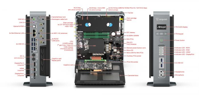 Durch die Kombination eines speziellen Mainboards mit einem passend abgestimmten Gehäuse und vielen durchdachten Details schafft es die israelische Firma Compulab, Workstation-Technik mit rund 200 Watt Verlustleistung ohne Lüfter zu kühlen. Im Airtop2 steckt der Quad-Core-Prozessor Xeon E3-1275 v6 (73 Watt) zusammen mit einer Grafikkarte vom Typ Nvidia Quadro P4000 (120 Watt), mehreren NVMe-SSDs und bis zu 64 GByte DDR4-RAM. Der Arbeitsspeicher und der PCIe-3.0-x16-Anschluss für die Grafikkarte sitzen auf einer anderen Mainboard-Seite als der Prozessor. Dadurch kann Compulab die CPU-Hitze auf die eine Gehäuseseite führen und die GPU-Hitze zur anderen.