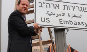 Jerusalems Bürgermeister Nir Barkat hat heute das erste Schild zur US-Botschaft in Jerusalem aufgehängt. Die Vorbereitungen für die festliche Einweihung der neuen amerikanischen Botschaft in Jerusalem laufen auf Hochtouren.