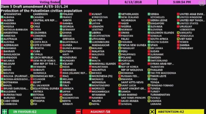 Die von der Türkei und Algerien eingereichte Resolution zur Verurteilung Israels wurde von zahlreichen europäischen Ländern unterstützt, wie Frankreich, Belgien, Spanien, Portugal, Schweden, Schweiz, Irland, Island, Griechenland, Finnland und Estland. Auch bedeutende Länder aus Asien, die sich als Freunde Israels sehen, stimmten für die Verurteilung, darunter China, Indien und Japan. 45 Länder enthielten sich der Stimme, ermöglichten dadurch aber die Annahme der Resolution gegen Israel. Gegen die Resolution stimmten neben Israel, den USA, Australien und Togo noch vier kleine Inselstaaten, die Marshal-Inseln, Mikronesien, Nauru und die Salomonen.