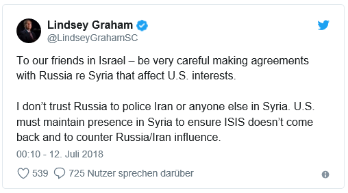 Als Netanjahu sich in Moskau mit dem russischen Präsidenten Wladimir Putin traf, twitterte Senatorin Lindsey Graham: „Unseren Freunden in Israel – seid sehr vorsichtig, Vereinbarungen mit Russland in Bezug auf Syrien zu treffen, die die Interessen der USA betreffen könnten. Ich vertraue Russland nicht, den Iran oder jeden anderen in Syrien zu kontrollieren. Die USA müssen ihre Präsenz in Syrien aufrechterhalten, um sicherzustellen, dass der IS nicht zurückkehrt und dem Einfluss Russlands / Irans entgegenwirkt. “