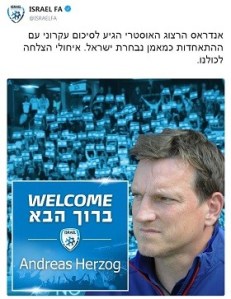 Der Israelische Fussballverband verkündete den erfolgreichen Vertragsabschluss gestern auf Twitter mit einem Bild, in dem er Herzog mit einem Baruch ha-ba und Welcome grüsste.