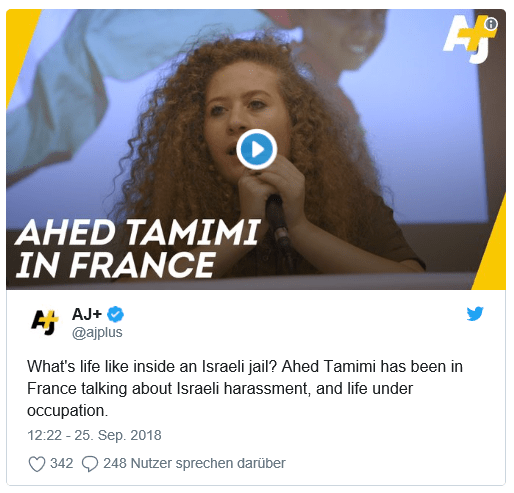 In einem Video fasst Tamimi ihre Eindrücke von ihrem Besuch zusammen. „Als ich in Frankreich ankam, sah ich, wie sehr die Menschen uns lieben und unterstützen und wie sehr sie sich für die Palästinensische Angelegenheit interessieren und die Befreiung Palästinas. Das hat mich sehr glücklich gemacht.“