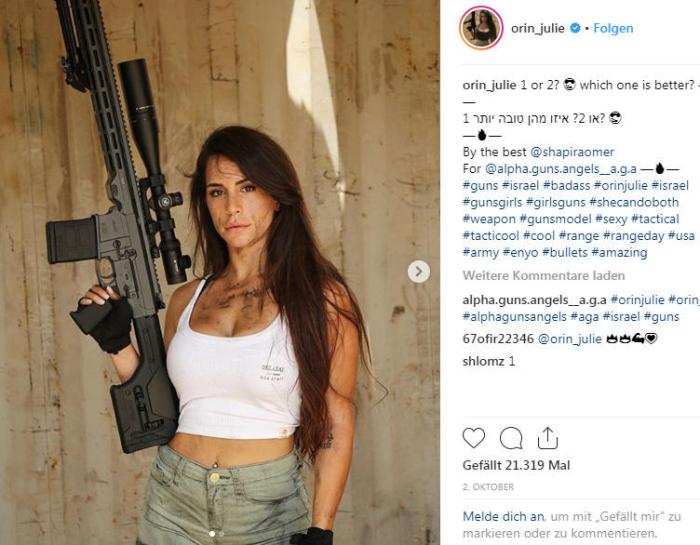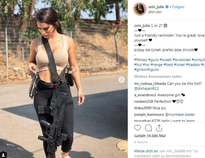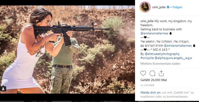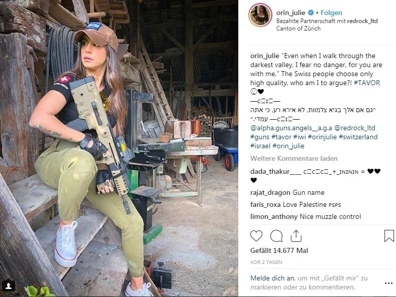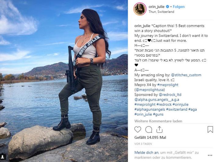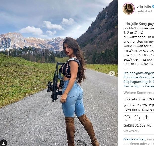 Orin Julie aus Israel liebt Waffen und knappe Kleidung. Dass diese Kombination auf Instagram auf Gefallen stösst, liegt auf der Hand. Nun hat es die Waffennärrin, die drei Jahre in der israelischen Armee (IDF) diente, in die Schweiz verschlagen. Dies, um auch hier für Fotos mit allerlei Schiesseisen zu posen – und damit via Instagram und Co. Werbung für Waffenfirmen zu machen.