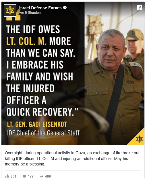 Generalstabschef Gadi Eizenkot sprach der Familie des Offiziers ebenfalls sein Beileid aus. Die israelische Armee sei dem Oberstleutnant M. mehr schuldig, als man sagen könne, sagte er. Dem verletzten Soldaten wünscht er eine rasche Genesung.