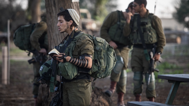 (Yochanan Visser / FOTO: Israelische Soldaten versammeln sich an einem Treffpunkt in der Nähe von Gaza und beten. Hadas Parush / Flash90)