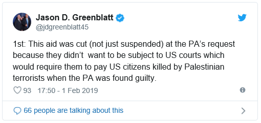 “Erstens: Diese Hilfe wurde auf Antrag der Palästinensischen Autonomiebehörde gekürzt (nicht eingestellt), weil sie nicht vor US-Gerichten gestellt werden möchten, die von ihr verlangen würde, Zahlungen an die Angehörigen von amerikanischen Terroropfern zu leisten, sollte ein Gericht die Palästinensische Autonomiebehörde für schuldig erklären, für die Anschläge verantwortlich zu sein.