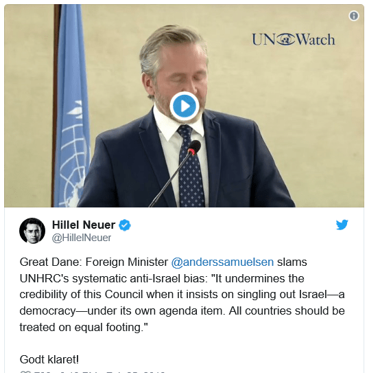 „Dänemark ist bereit, für einen Rat zu arbeiten, der alle Staaten gleich und fair behandelt. Darauf zu bestehen, ein Land, die Demokratie Israel, auszugrenzen und ihm einen gesonderten Tagesordnungspunkt zu widmen, untergräbt die Glaubwürdigkeit dieses Rates“, sagte Samuelsen.