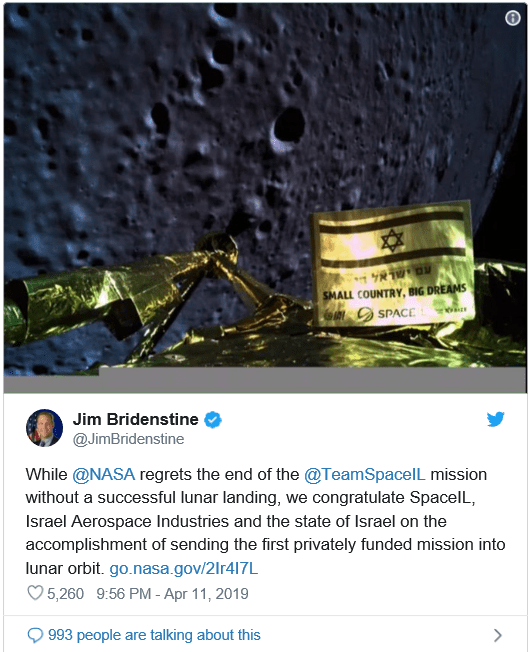 NASA-Chefs sagten in späteren Erklärungen und Veröffentlichungen auf Twitter, dass es dieser Gruppe von Israelis jedoch gelungen sein, die Welt zu inspirieren, indem sie die erste privat finanzierte und Mission zum Mond initiierte und beinahe vollendete.