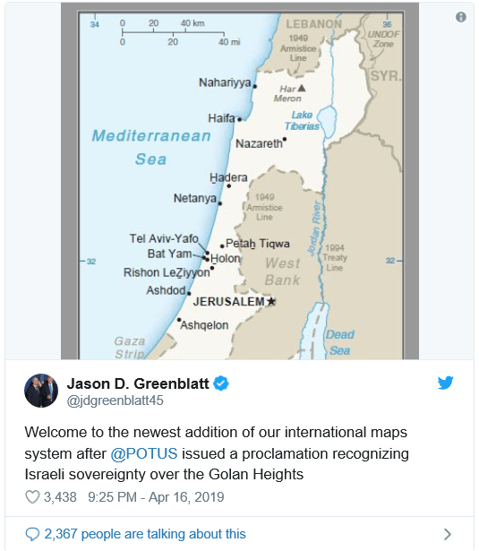 Darüber hinaus ändern nun US-Regierungsbehörden alle offiziellen Karten, um die Golanhöhen als Teil des Staates Israel aufzunehmen. Jason Greenblatt, Trumps Sonderbeauftragter für Nahost-Verhandlungen, twitterte: „Willkommen bei der neuesten Erweiterung unseres internationalen Kartensystems, nachdem @POTUS eine Proklamation zur Anerkennung der israelischen Souveränität über die Golanhöhen herausgegeben hat.“ Auf früheren Karten wurde der Golan als „besetztes Gebiet“ oder „umstrittenes Territorium“ definiert.