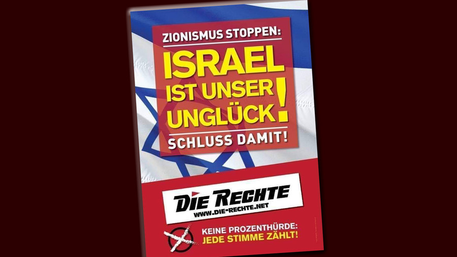 Die deutsche Nazi-Partei „Die Rechte“ wirbt im Europawahlkampf mit dem Slogan „Zionismus stoppen: Israel ist unser Unglück! Schluss damit“. Als Spitzenkandidatin fungiert die zur Zeit inhaftierte Holocaust-Leugnerin Ursula Haverbeck-Wetzel.