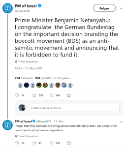 „Die Argumentationsmuster und -methoden der BDS-Bewegung sind antisemitisch“, heisst es in dem Antrag von Bundeskanzlerin Angela Merkel sowie der SPD, der Grünen und der Freien Demokratischen Partei der die Bundesregierung dazu aufruft „Der BDS-Bewegung entschlossen Widerstand leisten – Antisemitismus bekämpfen, keine Räumlichkeiten und Einrichtungen unter der Verwaltung des Bundestages mehr für Organisationen zur Verfügung zu stellen, die antisemitische Begriffe verwenden oder das Existenzrecht Israels in Frage stellen“.
