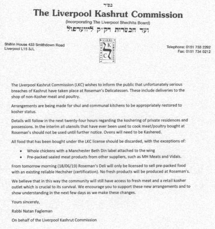 Die Besitzer des Ladens forderte der Rabbiner in seinem Schreiben auf, keine Geräte mehr zu benutzen, die je in Gebrauch gewesen seien, um Fleisch oder Geflügel zu kochen, das bei Roseman‘s verkauft worden sei. Zudem müssten alle Lebensmittel vernichtet werden, die den Stempel der Liverpooler Kaschrutkommission tragen würden. Das Geschäft pflegte auch, fertigverpacktes Fleisch von anderen Lieferanten zu verkaufen, und wird fortfahren dies zu tun.