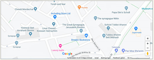 Mea Shearim St. 11, JerusalemTipp: Die Hausnummern sind nicht verlässlich auf der gegenüberliegenden Strassenseite zu finden, daher am besten Google Maps auf dem Smartphone verwenden. Eine israelische SIM-Card kostet wenig Geld und erleichtert die Navigation in den Städten erheblich.